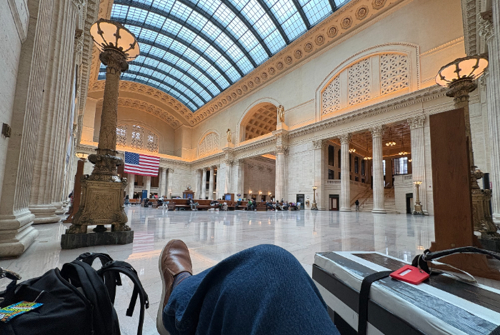 On our final morning, Mary and I go downstairs for coffee. Heading back to our room, I collect my refrozen freezer gel packs at the reception desk. I wash, dry, and cut up enough produce to make two salads. Mary and I retrieve our bags. Her Uber is early, so we say abbreviated goodbyes as she gets in the car. I walk back to Chicago Union Station. I have two and a half hours before my train leaves for Denver. I could sit on the hard wooden benches with everyone else, but I notice a corner of the Great Room that is completely empty. I set up my comfy portable train chair, relax, and watch the flow of train travelers.