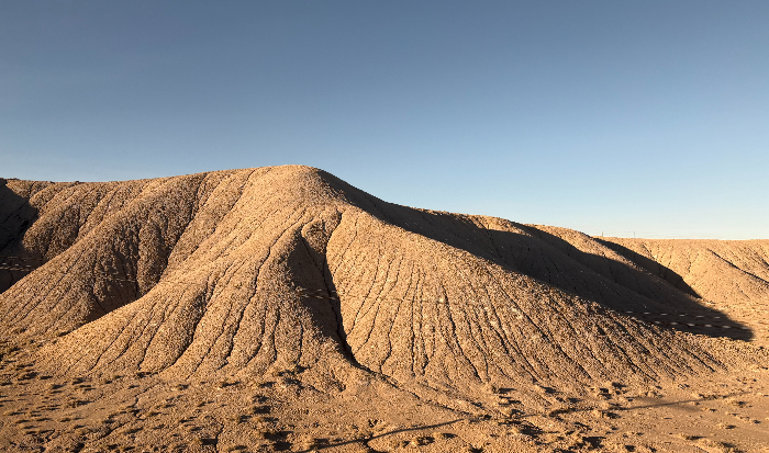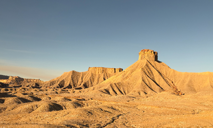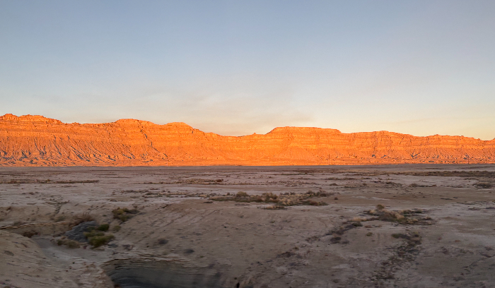 Shortly after leaving the mountains, we enter into a landscape dominated by dramatic Jurassic-era red sandstone formations. In front of these formations are lower gray hills, reminiscent of the Badlands in South Dakota. The gray hills have been carved by water in a way that reminds me of wrinkled elephant skin. This topography continues throughout the Eastern third of Utah, ending as we leave the town of Helper near sunset.