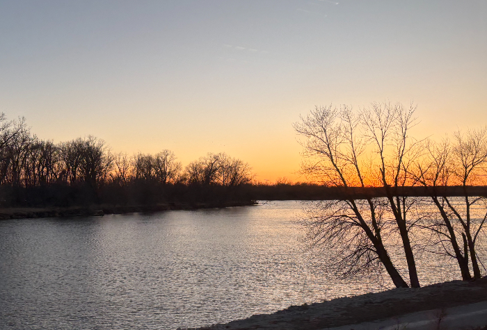 We are in Iowa now. Mary is still in Chicago due to a cascade of flight delays. We pull out of Ottumwa Station just as the sun sets over the Des Moines River.