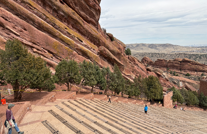 I quickly realize that I left the Windy City and am now in the Winded City. During the one and a half mile walk to the hostel I can really feel the effects of the mile-high atmosphere. Between my rail legs, lack of sleep and limited oxygen, I feel a bit dizzy. I check in to the 11th Ave Hostel and take a long, hot shower. While dressing, I see a text that says “Randy is waiting for you in the lobby”. He is the main reason I came to Denver. We went to the same junior high and high school. Our friendship was more peripheral at the time, but there is a mutual interest in getting to know one another. The first words out of his mouth are “I have about a hundred questions for you. It will only take about two hours.” We start getting caught up on the history of our lives and our circle of friends on the way to Red Rocks Park. The geology of Red Rocks is stunning, with three hundred million year-old sandstone formations situated in a way that suggests a music amphitheater. The suggestion was taken seriously in 1928 when Denver’s manager of Parks, George Cranmer, was visiting a Greek amphitheater in Sicily. Recognizing the similarities, he had an ‘aha moment’ and became determined to create an outdoor venue at Red Rocks. Although the rock formations gave the suggestion of an amphitheater, there was the minor issue of removing over ten thousand cubic yards of earth and boulders to make it a reality. There were no environmental impact statements back then, but there were people who might be upset about the re-engineering of the site. To keep the project on track he instructed his foreman to dynamite all of the boulders at the same time to avoid any possibility of citizens demanding a stop to the demolition. On the day of the explosions, Cranmer stayed away from his office. Construction began in 1936, with the first concert being performed in 1941. It has been a very popular performance venue ever since.