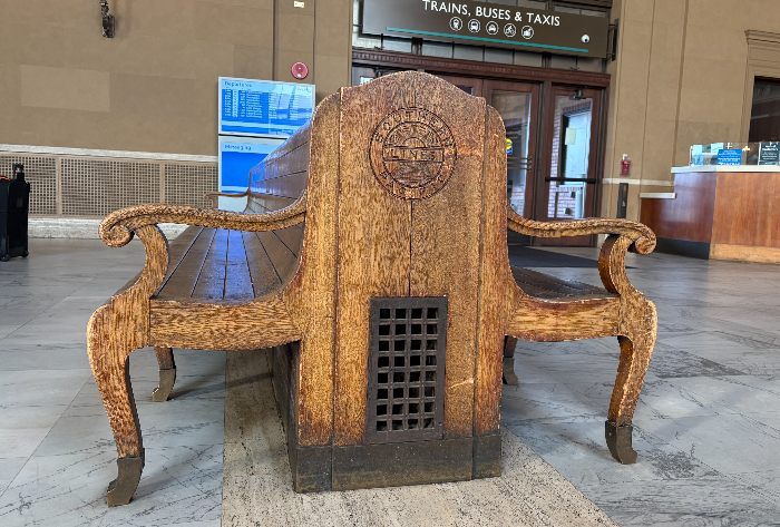 We pull in to Sacramento Valley Station an hour late. It’s not a problem for me, though, because my Coast Starlight train to Seattle doesn’t leave until nearly midnight and it is only 4PM. I could try to find a place to store my bags and go into town, but I’m running out of gas. I’ve been on the road/rails for over twenty days and am happy to content myself with resting in their historic train passenger lobby. Built in 1926, it featured the modern convenience of heated seats! The wooden church pew-style benches had steam running through pipes behind the backrests. The benches are still here, but the heating system is no longer functional.