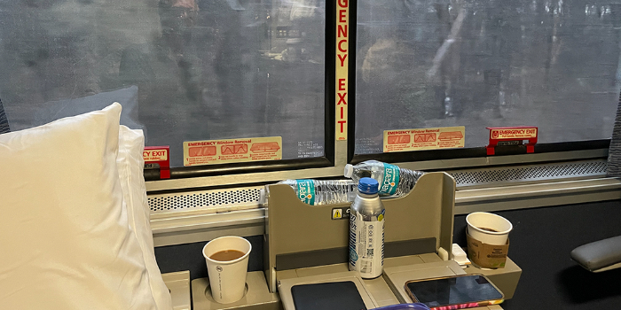 The upper bunk was much more comfortable than I expected, and I feel refreshed. The mattress is wide enough to curl up onto the safety straps, creating a cocoon-like space. I will sleep in one again. A very nice perk of being in a Sleeper is that your dining car meals are included. The dining car is a very pleasant experience, sharing your table with other passengers and eating delicious, albeit heavily caloric food. Unfortunately, on this trip, there is no table service, and our food arrives at our bedroom door, heavily wrapped and contained in plastic. (I try to avoid plastic waste whenever I can.) They do allow us to take our meals upstairs and eat them there, but the experience loses some of its magic. I find myself longing for my home-made Amtrak cooler with its tasty, healthful meals.