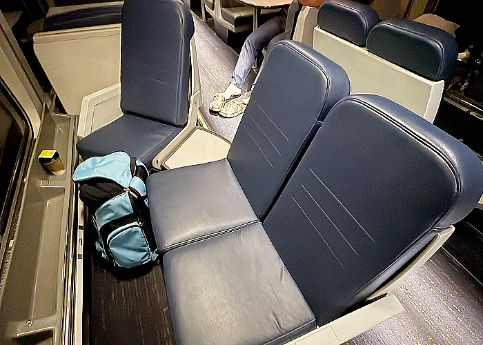 I board the train just after 7pm, looking forward to a good night’s sleep. Even though there are lots of empty seats, I’m assigned one next to a man who will not be getting off until 11pm. Not the end of the world, but slightly unusual. Typically I find Amtrak to be very good at giving overnight passengers an extra seat if there are seats to spare. I spend my time in the Sightseer Lounge car to get a little more privacy and to be able to stretch out. There are several groupings of three seats that can make a bed in a pinch. It is very common to see people sleeping in here at night. At 11pm the person sitting next to my coach seat gets off the train at the town of Kingman. I get up from my 3-seat bed and head back to the coach car to fall asleep.