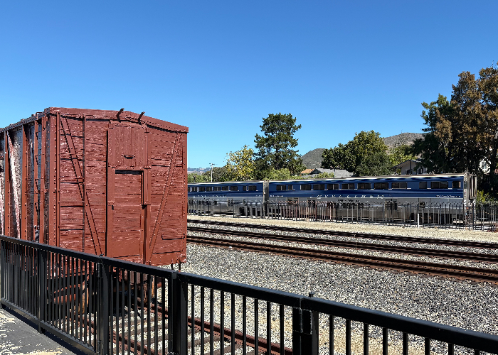 The scenery along this route is stunning. It follows the coast so closely that I feel like I could put my hand out the window and scoop up sand. I catch myself humming the tune Ventura Highway, by the band America. We arrive in San Luis Obispo around 1pm. It is 85 degrees out and I have two hours to kill. Five blocks away I find an outdoor cafe. I’m still full from eating my chicken sandwich on the train but order an iced coffee and bowl of vanilla ice cream. Walking back to the station I discover that San Luis Obispo has a train museum. They are closed today, but there are some interesting old railroad cars outside. The photo below shows an old wooden boxcar, with the southbound Surfliner in the distance.